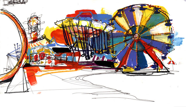 | Pencil crayon, gouache and fine liner. Quickly rendered. Applied in my sketchbook. Suggestions of colour, that depicts temperature, speed, emotion... |